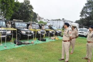 गाजीपुर । पुलिस अधीक्षक ओमवीर सिंह द्वारा पुलिस लाइन गाजीपुर में परेड की सलामी ली गई तथा इसके बाद पुलिस अधीक्षक द्वारा परेड का निरीक्षण किया गया। सभी अधिकारियों एवं कर्मचारियों द्वारा परेड किया गया।इसके बाद पुलिस अधीक्षक द्वारा विभिन्न थानों से आई हुई पुलिस की गाड़ियों का निरीक्षण कर उनमें रखे गए सुरक्षा संबंधी उपकरणों को चेक किया गया तथा संबंधित को आवश्यक दिशा निर्देश दिया गया। पुलिस अधीक्षक द्वारा डॉयल 112 की गाड़ियों का निरीक्षण कर गाड़ियों का रिस्पांस टाइम जाना गया। पुलिस अधीक्षक द्वारा पुलिस लाइन में स्थित विभिन्न शाखाओं का तथा पुलिस लाइन में हो रहे निर्माण कार्यों का निरीक्षण किया गया।