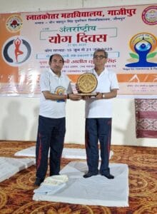 गाजीपुर। स्नातकोत्तर महाविद्यालय, गाजीपुर में 11 वां अंतर्राष्ट्रीय योग दिवस बड़े उत्साह एवं उमंग के साथ मनाया गया। इस वर्ष की थीम “एक पृथ्वी, एक स्वास्थ्य के लिए योग” थी। यह थीम पर्यावरण संरक्षण और शारीरिक, मानसिक व आत्मिक स्वास्थ्य को बढ़ावा देती है। कार्यक्रम में स्नातकोत्तर महाविद्यालय, तकनीकी शिक्षा एवं शोध संस्थान और कृषि विज्ञान केंद्र के शिक्षक, कर्मचारी और छात्र-छात्राएं शामिल हुए।कार्यक्रम में मुख्य अतिथि उत्तर प्रदेश शासन उच्च न्यायालय इलाहाबाद के अपर महाधिवक्ता व पीजी कॉलेज के सचिव अजीत कुमार सिंह थे। प्राचार्य प्रोफे० (डॉ०) राघवेन्द्र कुमार पाण्डेय ने बुके, स्मृति चिन्ह एवं अंगवस्त्रम देकर उनका स्वागत किया।कार्यक्रम सुबह 6:30 बजे प्रधानमंत्री नरेन्द्र मोदी के उद्बोधन और ओम ध्वनि के साथ शुरू हुआ। योग प्रशिक्षक श्री प्रेम नाथ उपाध्याय ने योगासन, प्राणायाम और ध्यान सिखाया। कुलाधिपति आनंदीबेन पटेल राजभवन, लखनऊ के निर्देशानुसार सुबह 8:00 से 8:10 बजे तक सामूहिक सूर्य नमस्कार किया गया जो सामूहिक सूर्य-नमस्कार विश्व रिकॉर्ड में दर्ज किया गया।