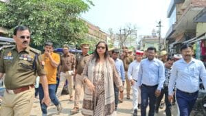 गाजीपुर।  लोकसभा सामान्य निर्वाचन- 2024 को सकुशल एवं शांतिपूर्ण सम्पन्न कराने के उद्देश्य से जिला निर्वाचन अधिकारी/जिलाधिकारी आर्यका अखौरी एवं पुलिस अधीक्षक ओमवीर सिंह ने मोहम्मदाबाद तहसील से सांसद बाजार, युसुफपुर बाजार, इलाहाबाद बैंक रोड, प्रिन्स सिनेमा रोड, फल मण्डी, युसुफपुर गंज एवं अन्य क्षेत्रों में रूट मार्च किया साथ ही बूथों का स्थलीय निरीक्षण किया । रूट मार्च के दौरान जिलाधिकारी एवं पुलिस अधिक्षक  द्वारा लोगो से जनसंवाद करते हुए वोट डालने की अपील किया गया। उन्होने तहसील मोहम्मदाबाद अन्तर्गत युसुफपुर सहकारी क्रय विक्रय समिति लि0 मुहम्मदाबाद बुथ संख्या- 129, 130 एवं एफ0एच0ए0 नर्सरी एजुकेशन सेन्टर बुथ संख्या- 121, 122, 123 का निरीक्षण कर वहां की साफ-सफाई, पेय जल, शौचालय, विद्युत आदि की व्यवस्था कराने का निर्देश दिया । इसी क्रम मे तहसील कासिमाबाद के अन्तर्गत ग्राम मुबारकपुर गंगौली में उपस्थित पुरूष एवं महिलाओं से जनसंवाद कर लोगो से अपने मत का शत प्रतिशत उपयोग करने की अपील किया । जिलाधिकारी एवं पुलिस अधीक्षक द्वारा बहादुरगंज के कायस टोला, दर्जी मोहल्ला, दक्षिण टोला, पुरानी मछली बाजार, सदर बाजार एवं अन्य क्षेत्रो में रूट मार्च किया गया। अधिकारी द्वय द्वारा माडल प्राइमरी स्कूल बहादुरगंज, मदरसतु मसाकिन बहादुरगंज एवं कन्या उच्च प्राथमिक विद्यालय बहादुरगंज में बनाये गये बूथों का स्थलीय निरीक्षण कर वहां के व्यवस्थाओं के बारे में जानकारी लेते हुए सम्बन्धित अधिकारी को व्यवस्था दुरूस्थ कराने का निर्देश दिया तथा साथ ही विद्यालय के बच्चो से वार्ता कर उनसे जाना कि भोजन समय से मेन्यू के अनुसार मिल रहा है कि नही बच्चो द्वारा बताया गया कि मेन्यू के अनुसार आज फल वितरण नही हुआ है जिस पर जिलाधिकारी ने नाराजगी व्यक्त करते हुए तत्काल बच्चो को फल वितरण कराने एवं आगे से मेन्यू के अनुसार बच्चो को भोजन वितरण कराने का निर्देश दिया। जिलाधिकारी एवं पुलिस अधीक्षक ने बच्चो को पढ़ाकर उनकी शिक्षा की गुणवत्ता को परखा।