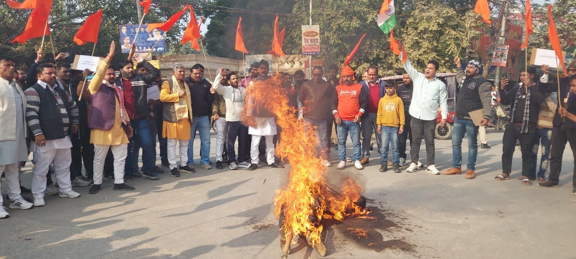 बांग्लादेश में हिंदू हत्या के विरोध में गाजीपुर में विहिप का प्रदर्शन, पुतला दहन