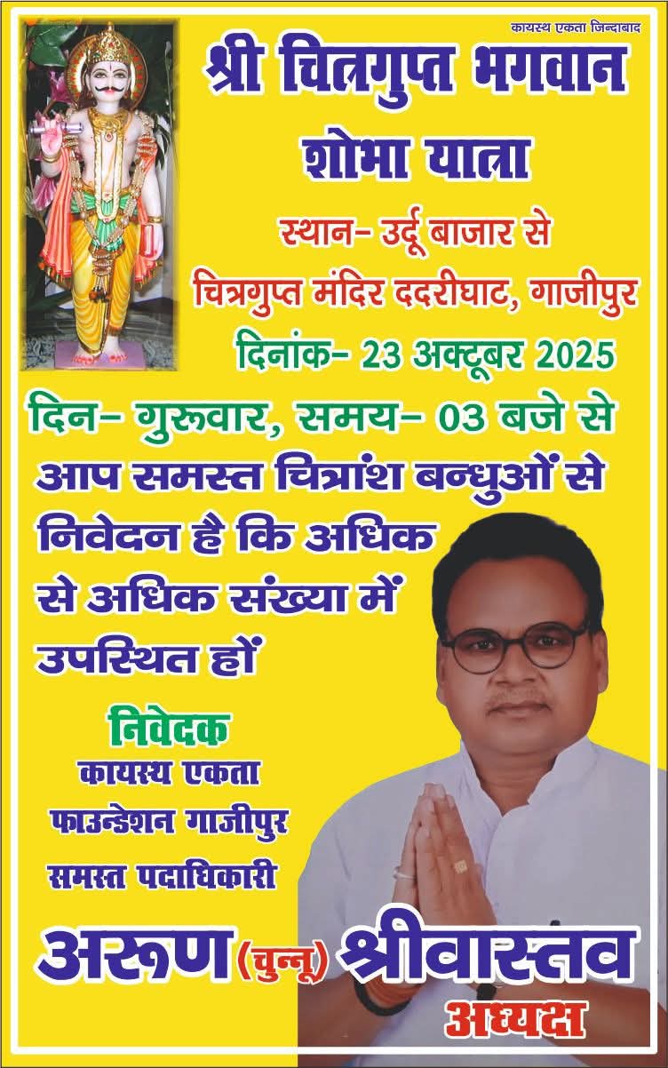 गाजीपुर।  श्री चित्रगुप्त भगवान की शोभा यात्रा को भव्य और सफल बनाने के लिए तैयारियां जोरों पर हैं। इसी क्रम में अरुण श्रीवास्तव ‘चुन्नू’ ने शहरवासियों से अपील की है कि वे अधिक से अधिक संख्या में शामिल होकर भगवान श्री चित्रगुप्त जी की शोभा यात्रा को ऐतिहासिक बनाएं।उन्होंने कहा कि यह  शोभा यात्रा समाज में एकता, आस्था और सांस्कृतिक विरासत का प्रतीक है। शोभा यात्रा में आकर्षक झांकियां, भजन-कीर्तन और धार्मिक कार्यक्रमों का आयोजन किया जाएगा। अरुण श्रीवास्तव  ‘चुन्नू’ ने कहा कि समाज की समृद्ध परंपरा को आगे बढ़ाने के लिए हर वर्ग का सहयोग आवश्यक है।इस अवसर पर उन्होंने युवाओं से विशेष रूप से आग्रह किया कि  श्रद्धा के साथ यात्रा में भाग लें, ताकि भगवान श्री चित्रगुप्त जी के आदर्शों का संदेश जन-जन तक पहुंचे।