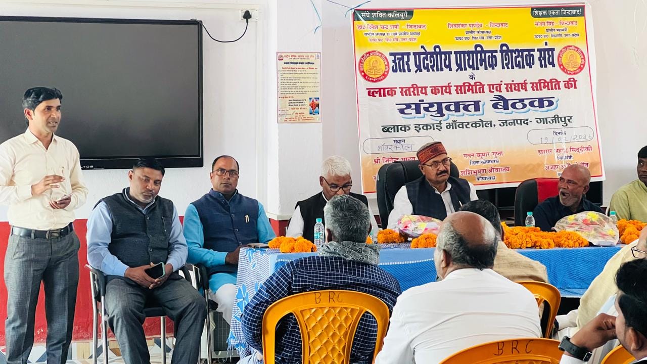 गाजीपुर। (भाँवरकोल) उत्तर प्रदेशीय प्राथमिक शिक्षक संघ, ब्लॉक इकाई भाँवरकोल की कार्य समिति एवं संघर्ष समिति की एक अति आवश्यक बैठक वृहस्पतिवार को उत्तर प्रदेशीय प्राथमिक शिक्षक संघ के तत्वावधान में बीआरसी भाँवरकोल पर आयोजित की गई। बैठक में जिलाध्यक्ष जितेन्द्र यादव, सदर मंत्री शिवमूरत सिंह कुशवाहा एवं अन्य कार्यकारिणी के सदस्यगण विशेष रूप से उपस्थित रहे। ब्लॉक अध्यक्ष राजेश सिंह यादव, मंत्री अजहर अली मोबीन, कोषाध्यक्ष शशिभूषण श्रीवास्तव, वरिष्ठ उपाध्यक्ष रमाशंकर सिंह यादव आदि में जिलाध्यक्ष एवं अन्य जिला कार्यकारिणी के सदस्यों का बुके देकर एवं माला पहनाकर स्वागत किया। बैठक में शिक्षकों की विभिन्न समस्याओं, लम्बित मांगों, पुराने शिक्षकों को टीईटी से छूट के साथ संगठन की आगामी रणनीतियों पर विस्तृत चर्चा की गई। जिलाध्यक्ष जितेन्द्र यादव ने शिक्षकों की एकजुटता पर बल देते हुए संगठन को मजबूत बनाने और समस्याओं के समाधान हेतु सामूहिक प्रयास करने का आह्वान किया।आगामी 22 फरवरी को ट्वीटर पर अभियान चलाने के लिए शिक्षकों को प्रेरित किया गया। सभी शिक्षकों ने एक जुट होकर संगठन को मजबूत बनाने एवं प्रत्येक लड़ाई में तन-मन-धन से सहयोग करने की हुंकार भरी।कार्ययक्रम की अध्यक्षता पूर्व अध्यक्ष दिनेश सिंह यादव ने किया एवं संचालन मु. आलिम हुसैन ने किया। इस अवसर पर रत्नाकर द्विवेदी, चन्द्रमोहन पाण्डेय, विश्वामित्र गुप्ता, अशफाक अहमद, तुलसी प्रसाद, त्रिपुरारी यादव, सिद्धार्थ कुमार, मालिक अहमद, सलाहुद्दीन, दीपक, विपुल राय, गुलाब सिंह, अक्षय गिरी आदि के साथ सैकड़ो शिक्षक उपस्थित रहे।