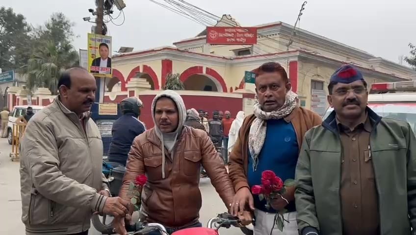 गाजीपुर । राष्ट्रीय सड़क सुरक्षा माह के तहत एक जागरूकता रैली निकाली गई।गाजीपुर एसपी ईरज राजा ने हरी झंडी दिखाकर जागरूकता रैली को रवाना किया।सड़क सुरक्षा अभियान लोगों को जागरूक करने के लिए रायफल क्लब से निकाली गयी रैली ने शहर के विभिन्न इलाकों में भ्रमण किया।रैली के जरिये पुलिस और परिवहन विभाग की ओर से लोगों को दुर्घटना से बचने के लिए जागरूक किया गया।इस दौरान लोगों को यातायात नियमों के पालन के प्रति भी जागरूक किया गया।इस दौरान यातायात नियमों का पालन न करने वालों को विभाग के अफसरों ने गुलाब का फूल देकर और माला पहना कर यातायात नियमों का पालन करने का आग्रह किया गया।