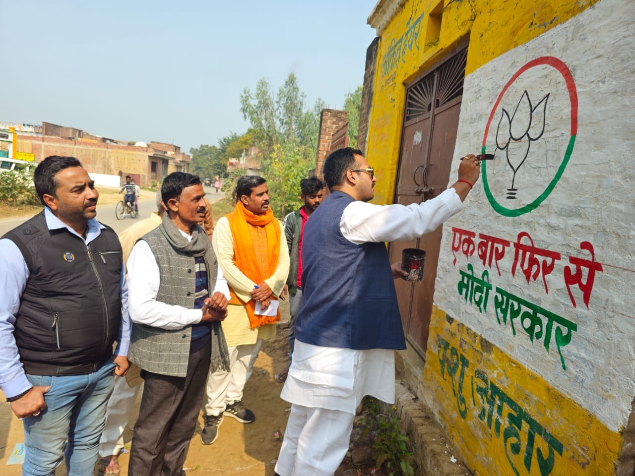 पीयूष राय ने दीवार पर कमल का फूल बनाकर लिखा एक बार फिर मोदी सरकार